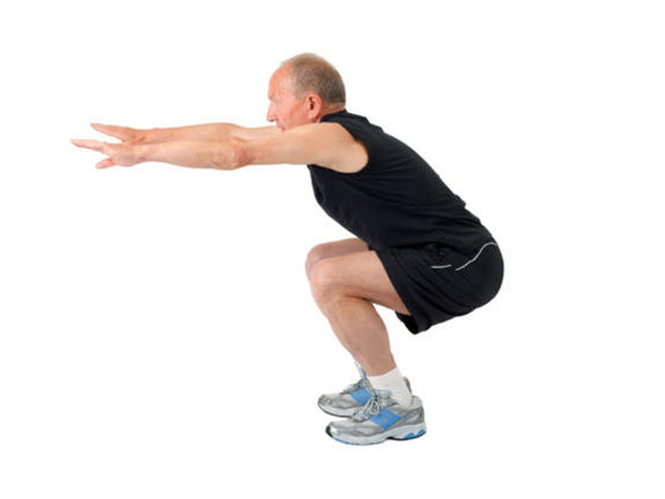 Đứng thẳng, hai chân dang rộng bằng vai. Đưa hai tay lên trời. hạ người xuống giống như bạn đang chuẩn bị ngồi xuống, đồng thời, hạ tay xuống ngang trước mặt. Đảm bảo rằng hai bàn chân hướng về phía trước, giữ tư thế này trong vài giây. Ở bài tập này có thể để hai tay thả lỏng ở hai bên người.